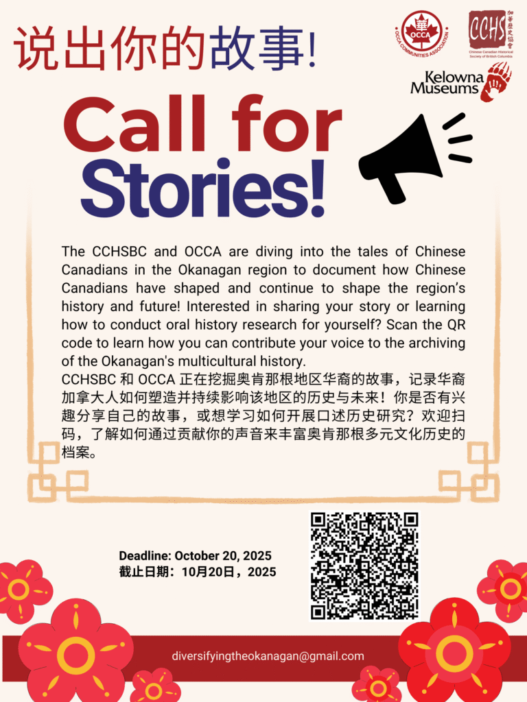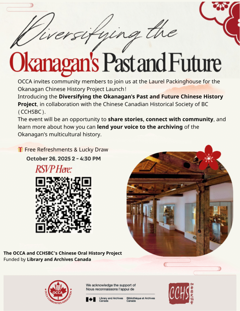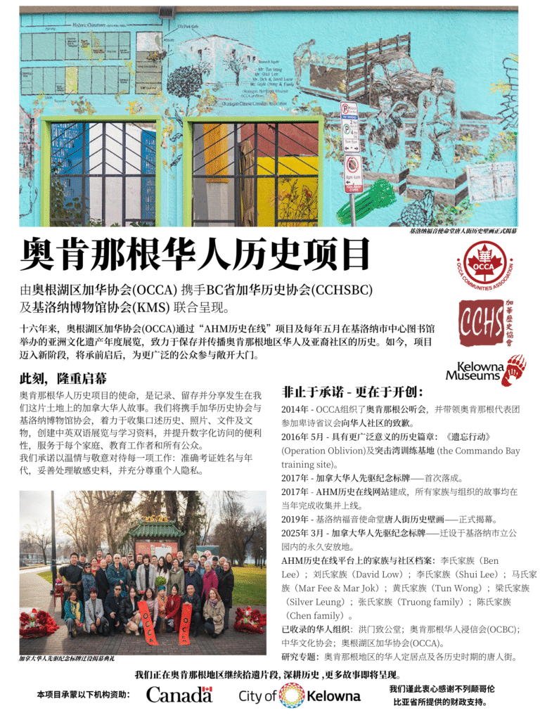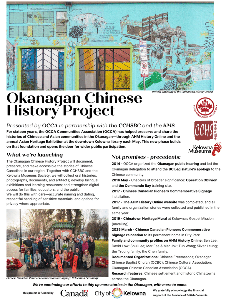 After sixteen years of dedication, we are thrilled to announce that the OCCA, in collaboration with the Canadian Chinese Historical Society of BC (CCHSBC) and the Kelowna Museums Society (KMS), has seen the “Okanagan Chinese Canadian History Project” included in the national collection of Library and Archives Canada.