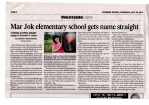 2014 – Mar Jok Elementary School opens in the Rose Valley Community. The school was named in honour and remembrance of Jok’s service, charity and benevolence to the Okanagan community.